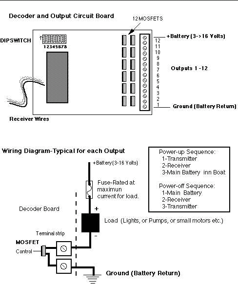 - Connect the positive lead of the main battery through a 1/4 amp fuse, to the positive terminal on the terminal strip. This supplies a small amount of current to power the output circuit on the decoder board. If more than 1 battery is used, it does not matter which one is connected to the positive terminal of the terminal strip as long as the voltage is between 3 and 16 volts.